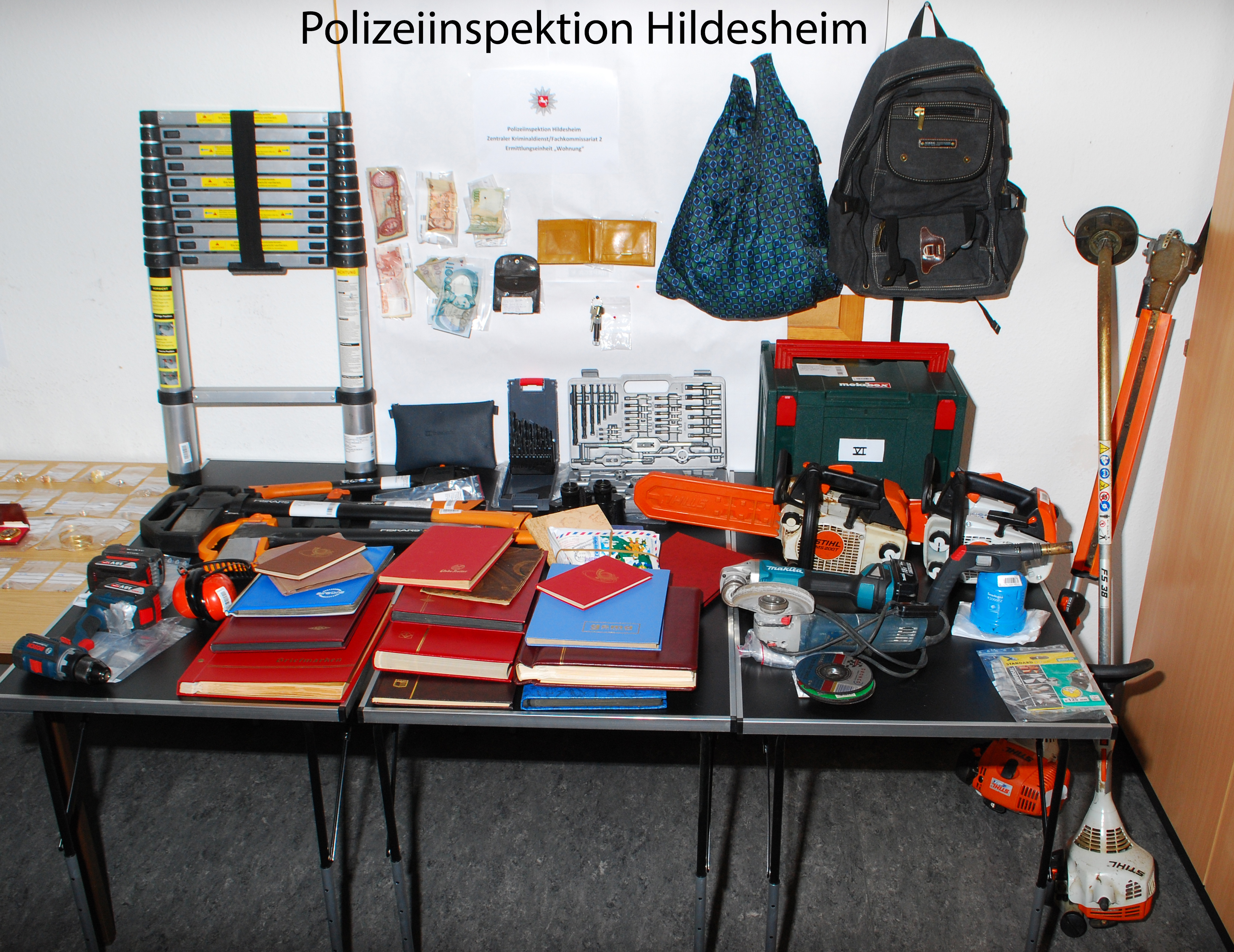 Diverser Schmuck, Uhren, Geldbörsen mit ausländischen Währungen, Briefmarkensammlungen, ein neuwertiger Rucksack und diverse Werkzeuge verschiedenster Marken wurden beschlagnahmt.