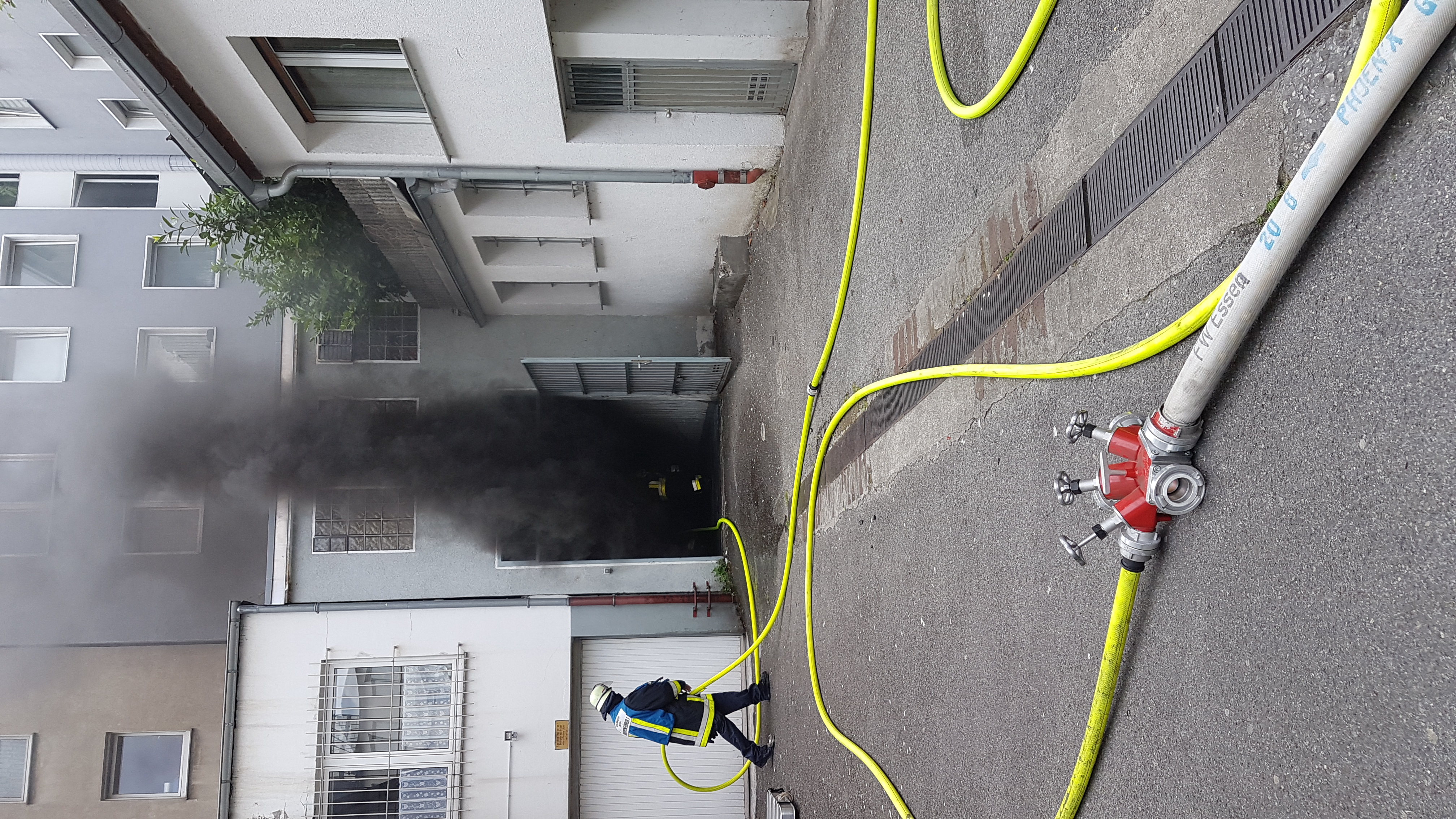 Essen-Stadtmitte, Kreuzeskirchstraße, 17.06.2018, 16:34 Uhr (ots) - Gegen kurz nach 16:30 Uhr meldeten Anwohner schwarzen Rauch aus einer Garage. Die ersteintreffenden Feuerwehrkräfte wurden auf einen Hinterhof im Bereich Kreuzeskirchstraße / Rottstraße geführt. Hier drang dichter, schwarzer Rauch aus den Oberlichtern eines Tores. Zu diesem Zeitpunkt gab es keine Informationen darüber wie der Kellerbereich genutzt wird und ob es direkte Zugänge in die angrenzenden fünfgeschossigen Gebäude gibt. Im Erdgeschoß des Gebäudes waren eine u.a. Bar, zwei Gaststätten sowie ein Frisörgeschäft untergebracht. Die Obergeschosse wurden zu Wohnzwecken genutzt. Nach dem Öffnen des ersten Tores ging ein Angriffstrupp mit einem Rohr und einer Wärmebildkamera unter dem Schutz von drei Pressluftatmern in das Gebäude vor, konnte aber in dem begehbaren Teil keinen Brandherd finden. Nach dem Öffnen eines weiteren Tores konnte der Brandherd in einem ca. 150m² großen Lagerbereiches einer der Gaststätten entdeckt werden. Es brannte im Bereich einer Eismaschine. Der Brand konnte mit einer geringen Wassermenge schnell gelöscht werden. Zeitgleich zum vorgehenden Angriffstrupp kontrollierte ein weiterer Trupp das betroffene Gebäude auf eine Ausbreitung des Brandrauches. Die erste Meldung, dass es sich um eine Tiefgarage handeln sollte bestätigte sich im Nachhinein nicht. Nach umfangreichen Lüftungsmaßnahmen mit zwei Überdrucklüftern durchgeführte Schadstoffmessungen gaben keinen Hinweis auf eine Gefährdung. Somit konnten nach abschließenden Arbeiten alle Bewohner und Gäste wieder ins Gebäude zurückkehren. Die Polizei übernahm die Einsatzstelle zur Brandursachenermittlung. (md)