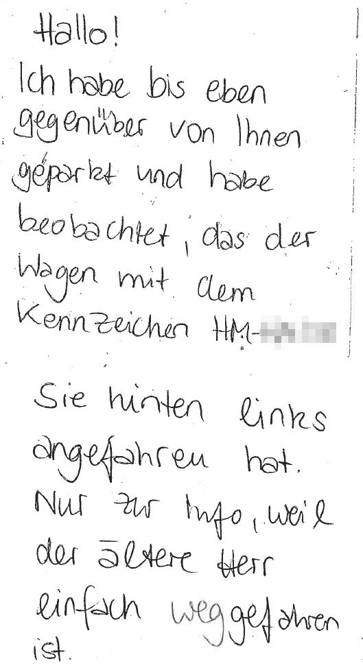 Die Fahrerin des nun beschädigten Fahrzeuges stellte ihren grauen Toyota Corolla gegen 09.00 Uhr auf einem Parkplatz vor dem Bahnhof ab. Als sie gegen 13.50 Uhr zum Wagen zurückkehrte, fand sie neben den frischen Beschädigungen im Heckbereich auch eine handgeschriebene Notiz, die offensichtlich von einer noch unbekannten Zeugin am Toyota hinterlassen wurde.