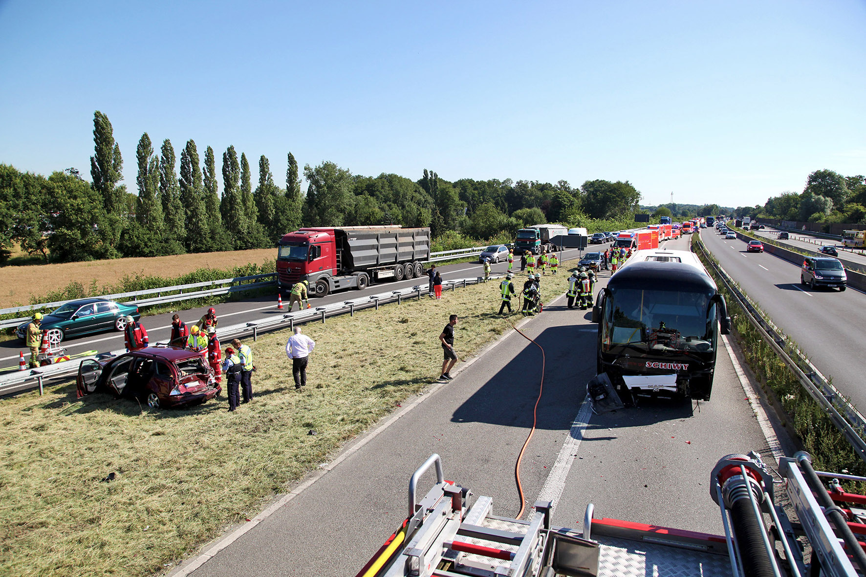 Essen-Schuir, A 52 AS 25 (Breitscheider Kreuz) Fahrtrichtung Düsseldorf, 28.06.2018, 09.34 Uhr (ots) - Heute Morgen gegen halb zehn hat sich auf der A 52 in Richtung Düsseldorf ein schwerer Verkehrsunfall ereignet. Kurz vor dem Autobahnkreuz Breitscheid ist ein mit 46 Schülerinnen und Schülern sowie drei Lehrkräften voll besetzter Reisebus eines Hattinger Busunternehmers auf einen Mercedes Kombi aufgefahren. Der Mercedes kam auf einem Grünstreifen vor einer Leitplanke zum Stehen. Der Fahrer, der allein unterwegs war, wurde schwer verletzt. Ein Toyota fuhr auf das Heck des Busses auf, in das Heck des Toyotas wiederum krachte ein Opel Corsa. Auch diese beiden Fahrzeugführer waren jeweils alleine in ihren Autos, beide wurden verletzt. Im Bus erlitten zwei junge Frauen (16 und 17 Jahre alt) leichte Blessuren und klagten über Kreislaufprobleme. Alle fünf Patienten wurden nach rettungsdienstlicher Versorgung mit Rettungswagen der Feuerwehren Ratingen und Essen in umliegende Krankenhäuser transportiert. Ein ebenfalls alarmierter Rettungshubschrauber kam nicht zum Einsatz. Die übrigen 44 Businsassen, Schülerinnen und Schüler der Essener Gustav-Heinemann-Gesamtschule auf dem Weg zu einem Freizeitpark, führten Ratinger Einsatzkräfte gesammelt von der Autobahn hinunter zur Bundesstraße 1, von dort wurden sie in ein nahegelegenes Gemeindeheim gefahren und betreut. Auch dort war ein Arzt vor Ort, es gab aber keine behandlungspflichtigen Patienten. Später fuhr ein Ersatzbus vor, der die Jugendlichen verspätet, aber unversehrt zum Ziel brachte. Dort trafen sie auf ihre Schulkameraden, die mit zwei weiteren Bussen das Ziel bereits erreicht hatten. Die Unfallursache ist unklar. Das Geschehen löste einen Stau auf der A 52 aus, in dem sich knapp eineinhalb Stunden später ein weiterer Unfall ereignete (siehe Folgemeldung). (MF)