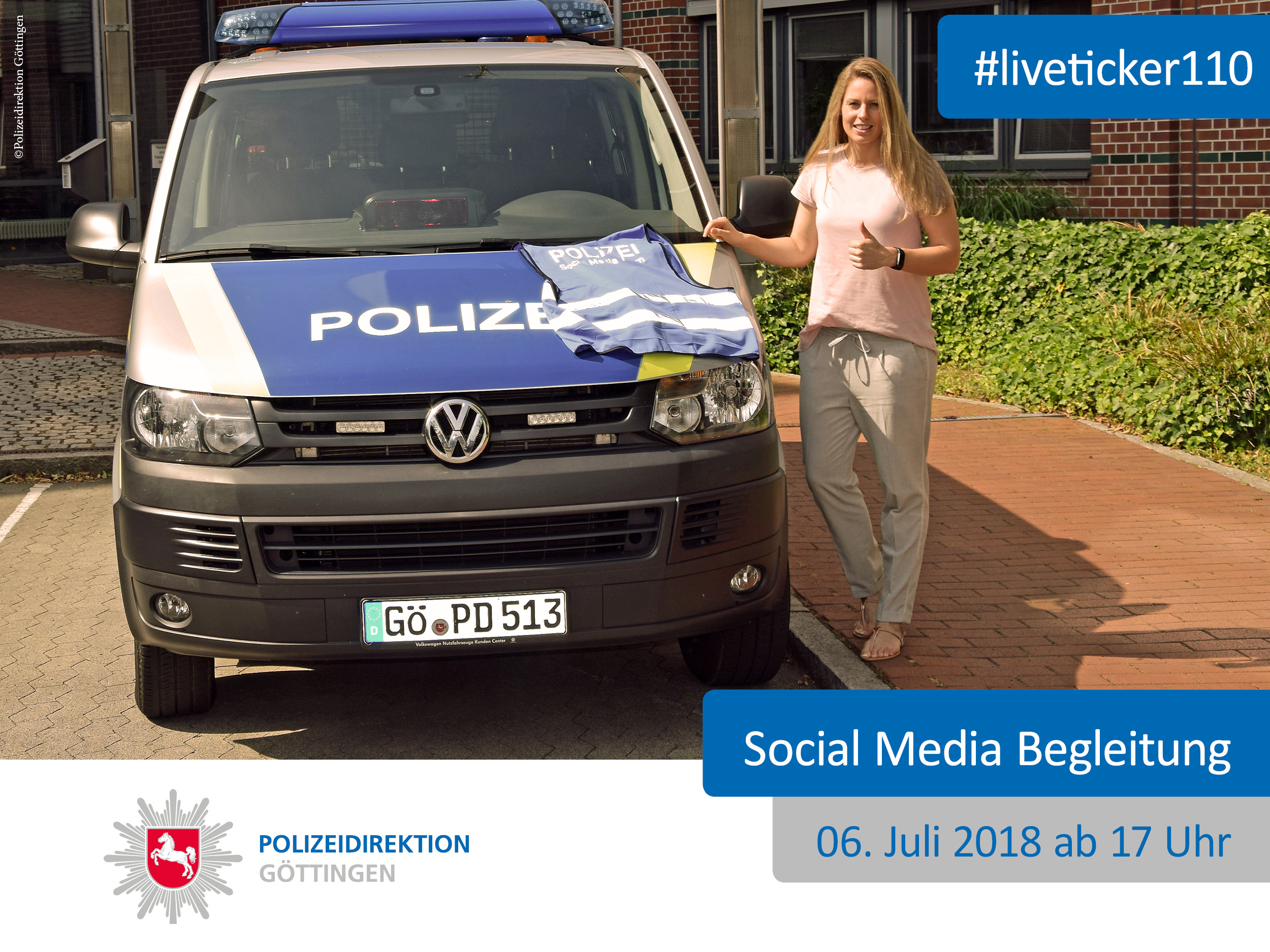 Unter dem Hashtag liveticker110 (#liveticker110) twittert die Social Media Managerin der Polizeidirektion Göttingen, Nicole Kappei, live aus der Lage- und Führungszentrale "Weser" und begleitet den Einsatz- und Streifendienst der Polizeiinspektion Göttingen auf den Straßen Göttingens, berichtet aber auch von den Einsätzen rund um Göttingen. Die Livebegleitung kann direkt über unseren Link geöffnet und mitverfolgt werden: http://bit.ly/liveticker110 (Twitter @Polizei_GOE) - und das übrigens auch, ohne selbst über einen Twitter-Account zu verfügen. Darüber hinaus findet auch eine Begleitung auf der Facebook-Seite Polizei Göttingen statt.