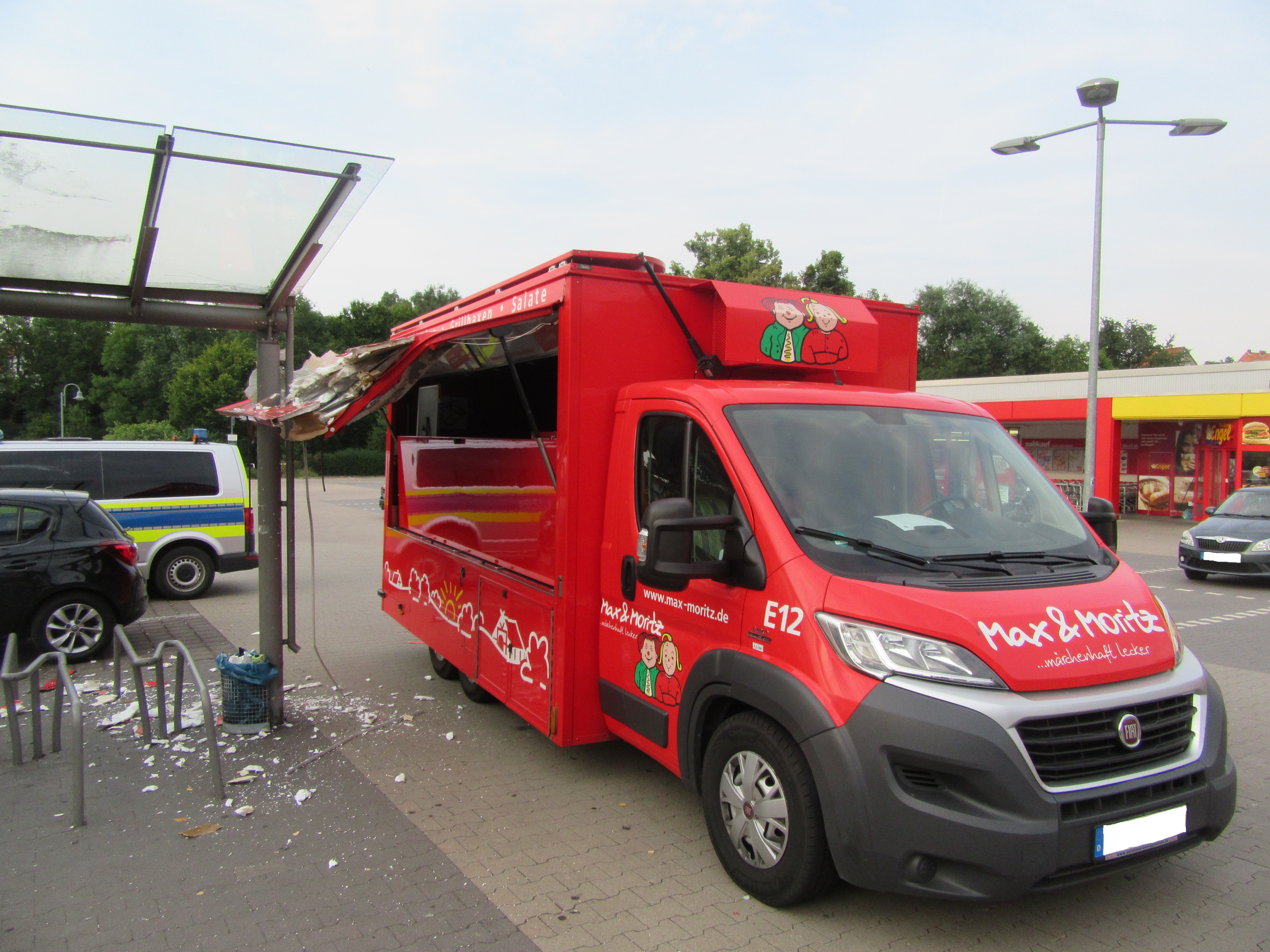 Nach Verkaufsende hatte das Bedienpersonal vergessen, die Verkaufsklappe seines Hähnchengrills zu schließen und stieß nach Fahrtantritt mit dem waagerecht abstehenden Fahrzeugteil gegen die gläserne Überdachung eines Fahrradständers. Der Gesamtschaden wird seitens der Polizei aus Stadtoldendorf geschätzt auf 7000 Euro.