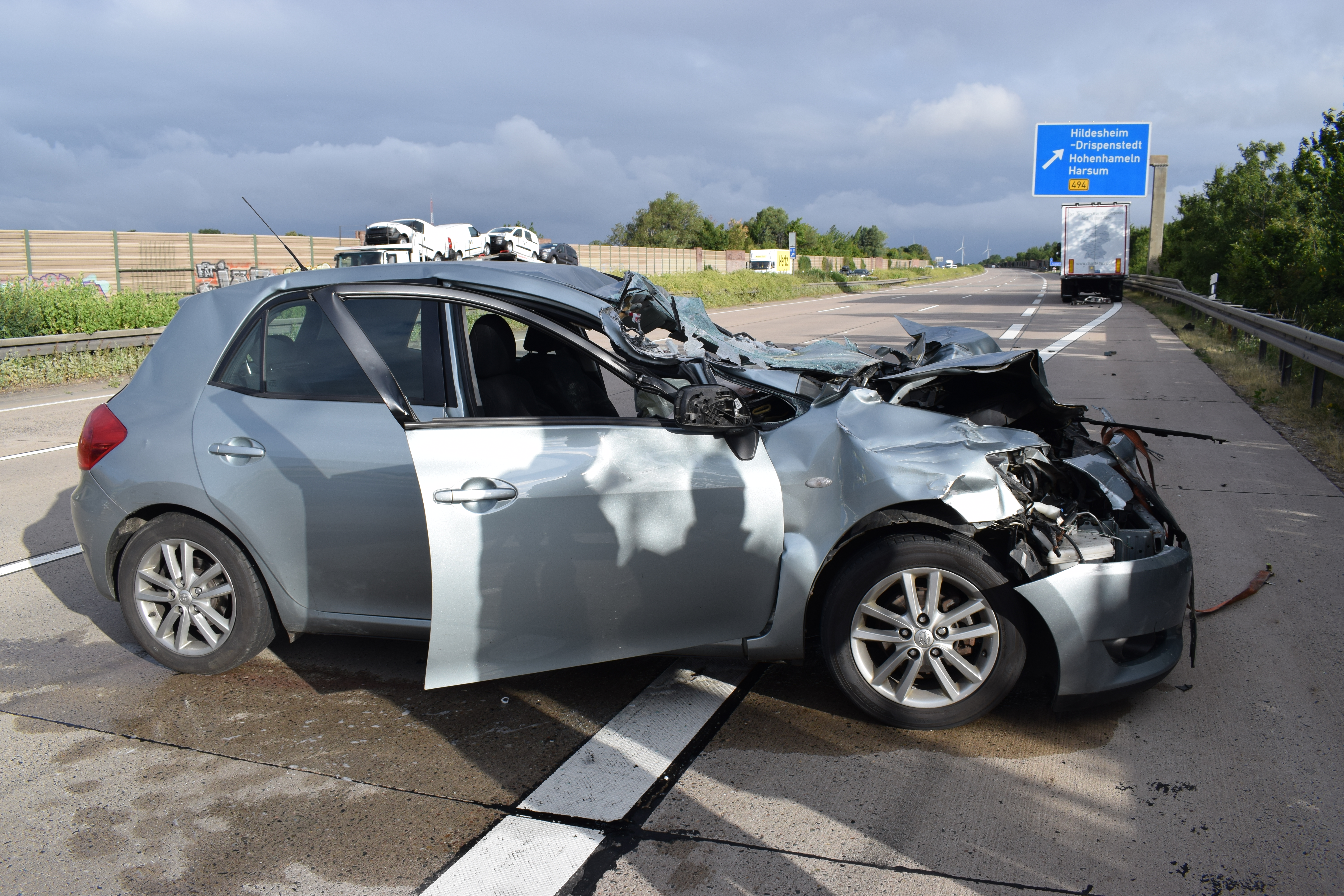 Ein 57-jähriger Toyota Fahrer und seine gleichaltrige Ehefrau befahren den mittleren Fahrstreifen ebenfalls in Richtung Hannover. Der Fahrer sieht den Spanngurt nicht und überfährt diesen. Der Gurt verklemmt sich am Fahrzeug und die sich am Spanngurt befindliche Ratsche schleudert in die Windschutzscheibe. Da der Gurt sich um einen Reifen des PKW wickelte, kommt das Fahrzeug ins Schleudern und prallt unter einen auf dem rechten Fahrstreifen fahrenden Sattelzug. Der Toyota wird von dem Sattelzug mehrere hundert Meter mitgeschleift, ehe er auf dem rechten Fahrstreifen zum Stehen kommt.