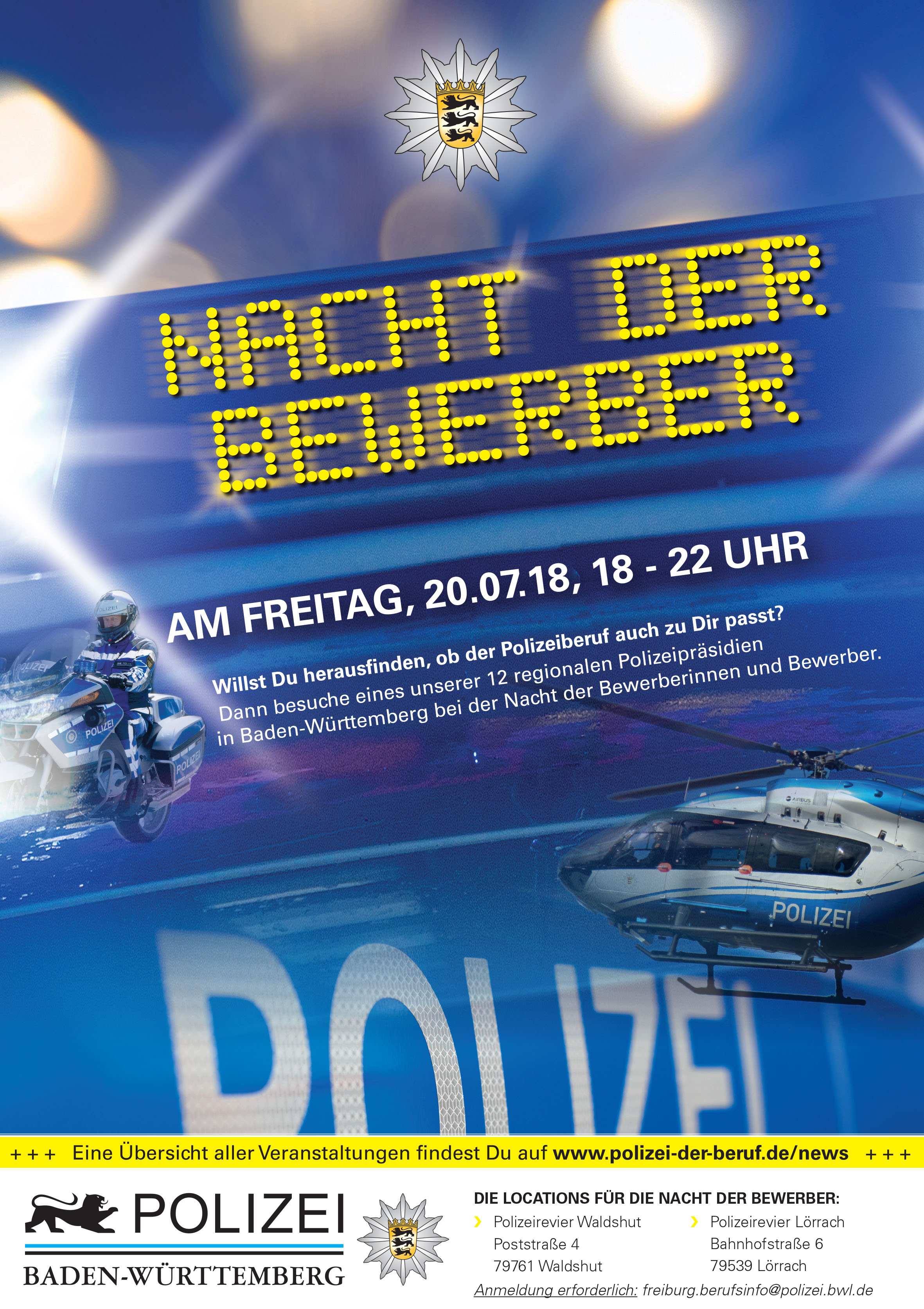 Freiburg (ots) - Die Nacht der Bewerberinnen und Bewerber 2018 am *** Freitag, den 20. Juli 2018, in der Zeit von 18.00 - 22.00 Uhr *** beim Polizeirevier Waldshut-Tiengen, Poststraße 4, 79761 Waldshut.