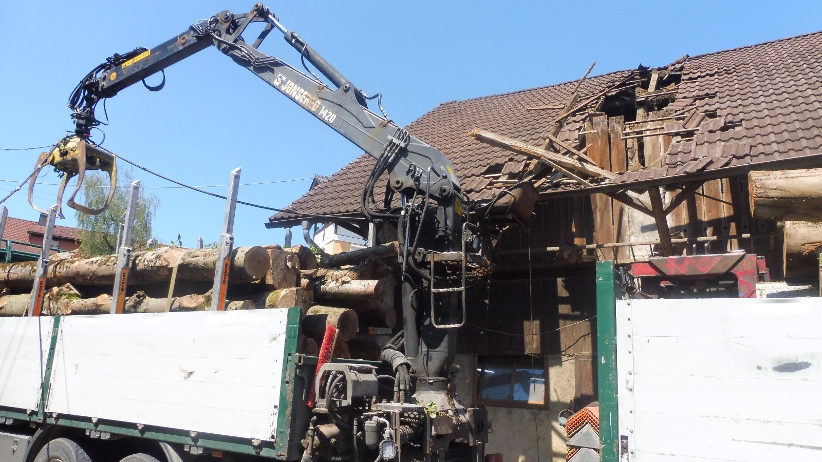 Zu einem spektakulären Unfall kam es am Donnerstagmorgen in der Hauptstraße. Ein 48-jähriger Mann lud gegen 11 Uhr mittels Greifarm Baumstämme auf einen Lkw und den Anhänger. Als der Mann nach Beendigung der Arbeiten losfuhr, vergaß er, den Greifarm wieder einzufahren. So kam es wie es kommen musste: Der ausgefahrene Greifarm blieb an einer Leitung und einem Stahlkabel hängen, die beide von einem Stalldach zum Dach eines Schopfs gespannt waren. Dadurch wurden am Stalldach die Quer- und Längsbalken sowie die Dachziegel auf einer Länge von etwa 6 Metern und einer Breite von ca. 2 Metern vollständig abgerissen. Der geschätzte Sachschaden am Dach beträgt etwa 40000 Euro. Der Lkw wurde nicht beschädigt, verletzt wurde niemand. Während der Unfallaufnahme musste die Hauptstraße komplett gesperrt werden. Die Freiwillige Feuerwehr Hasel war zur Unterstützung an der Unfallörtlichkeit.
